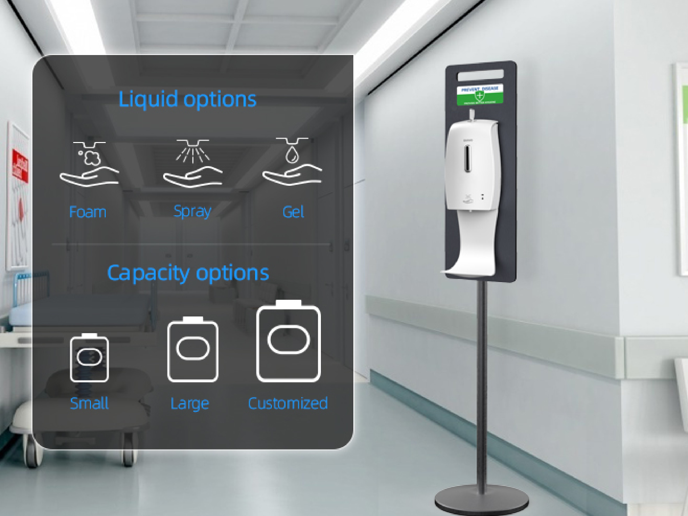 Touchless hand sanitizer dispenser stands should be located at the entrance of every public or private commercial building and on transportations. The number and type of installations should be decided according to the number of expected users, keeping in mind children, elderly, and individuals with limited mobility.